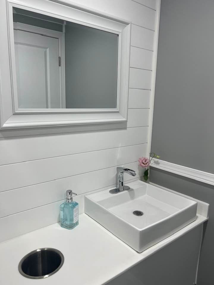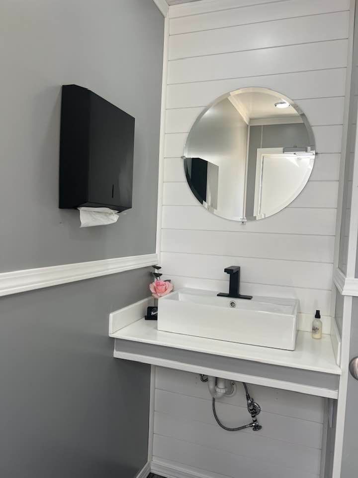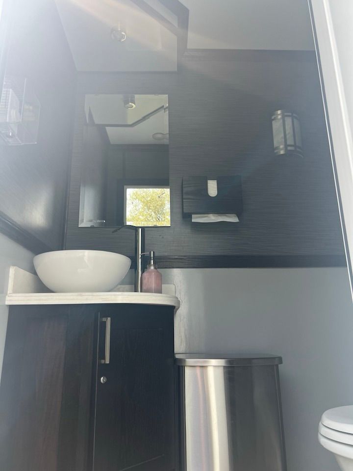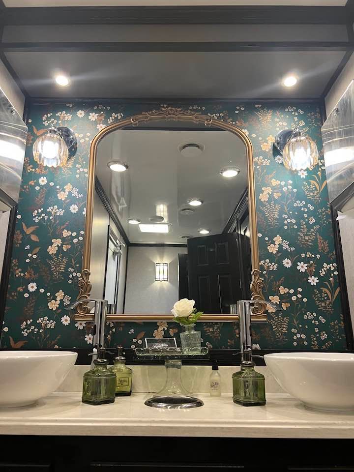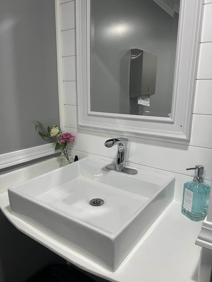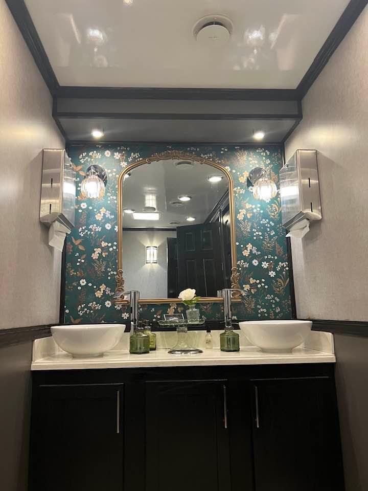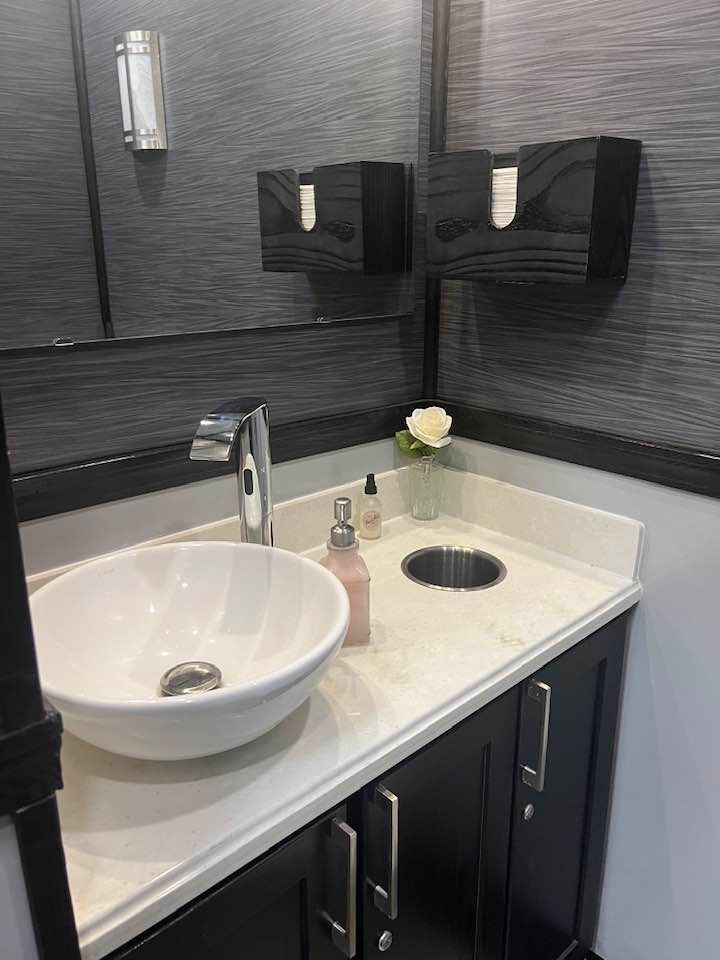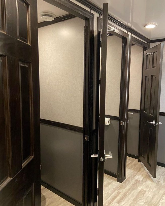 The Majestic, is one of our largest luxury trailers and can accommodate up to 500 guests! This unit has a hotel vibe and is great for larger groups with her two doors and six stations. The Majestic is equipped with private commodes, touchless faucets, above counter sinks, and hands-free flushing toilets. This luxurious restroom will keep your guests cool in the summer and warm in the winter, while enjoying the music feature!