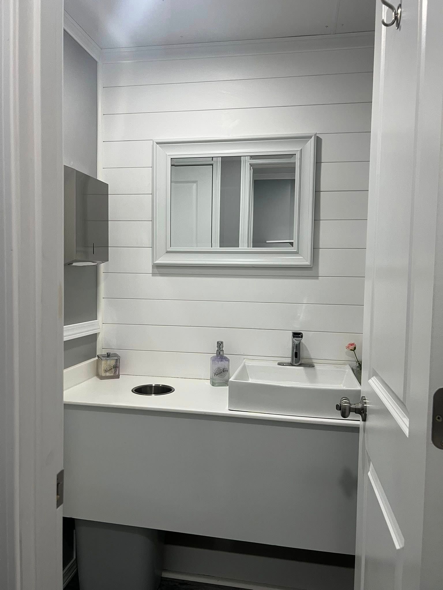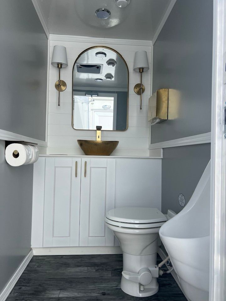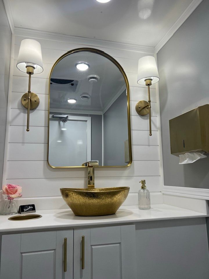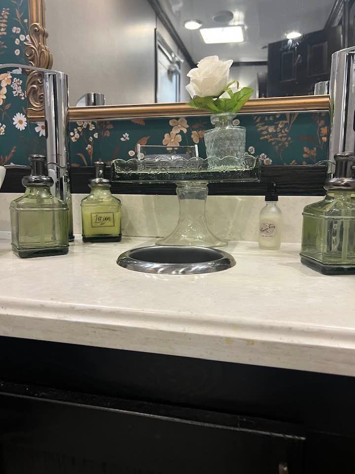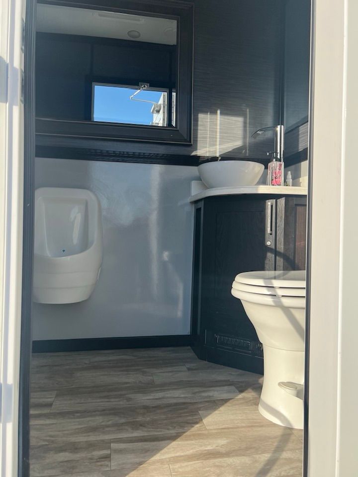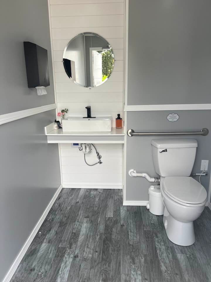 The Majestic, is one of our largest luxury trailers and can accommodate up to 500 guests! This unit has a hotel vibe and is great for larger groups with her two doors and six stations. The Majestic is equipped with private commodes, touchless faucets, above counter sinks, and hands-free flushing toilets. This luxurious restroom will keep your guests cool in the summer and warm in the winter, while enjoying the music feature!