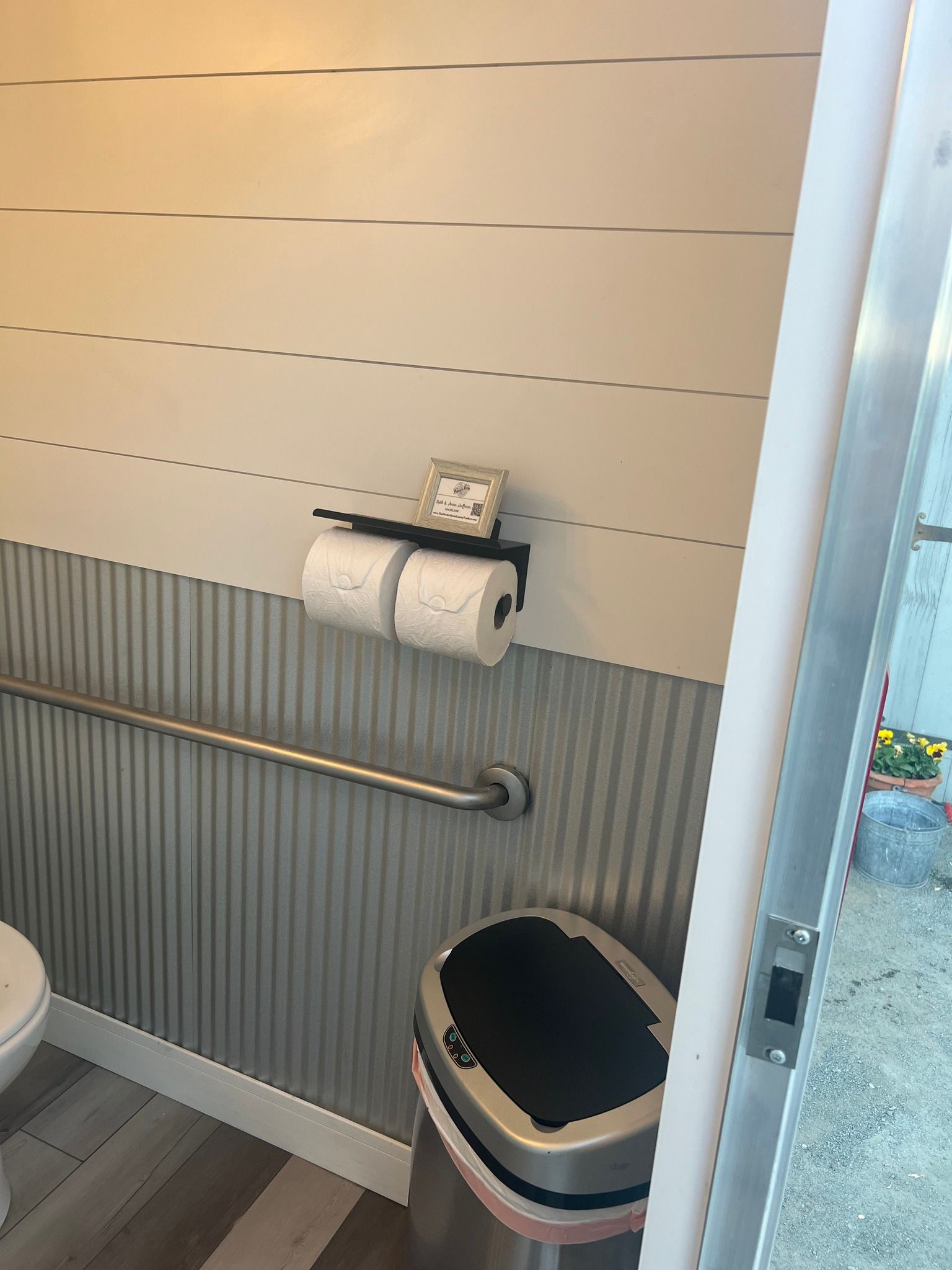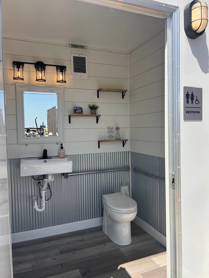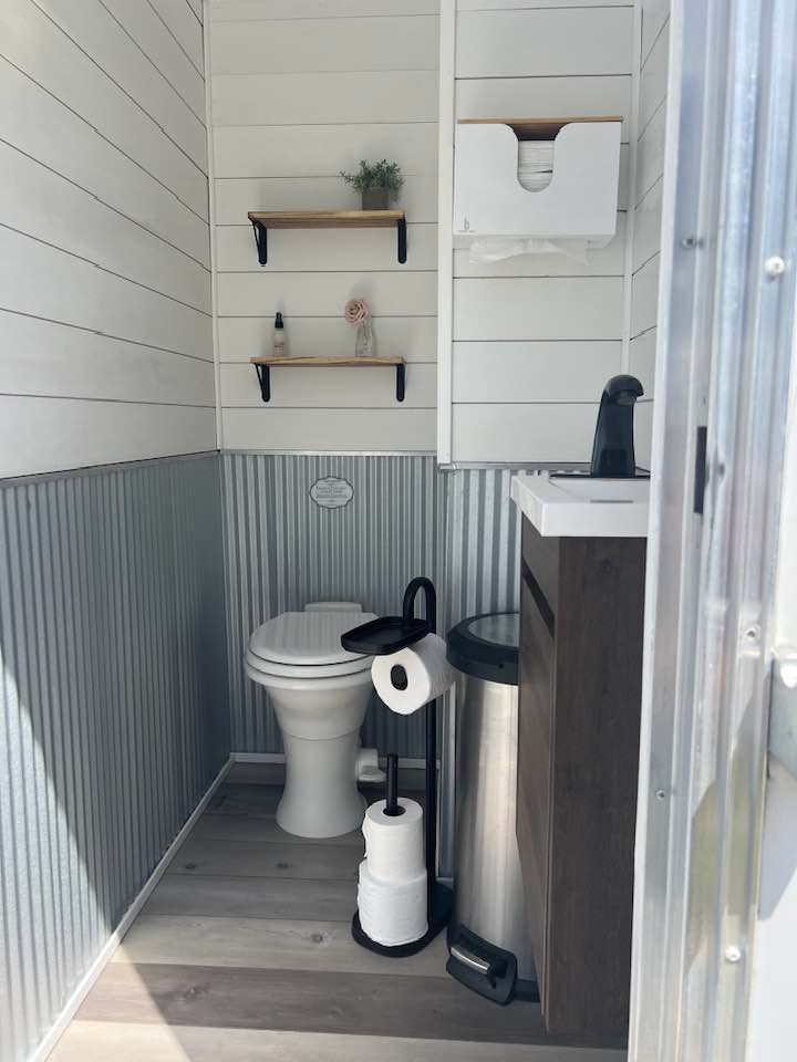 for a total of 3 separate rooms to accommodate your guests! The curated decor invites your guests to enjoy the space with both AC /heat and touchless faucets. This trailer brings farmhouse modern to your venue with special touches throughout!