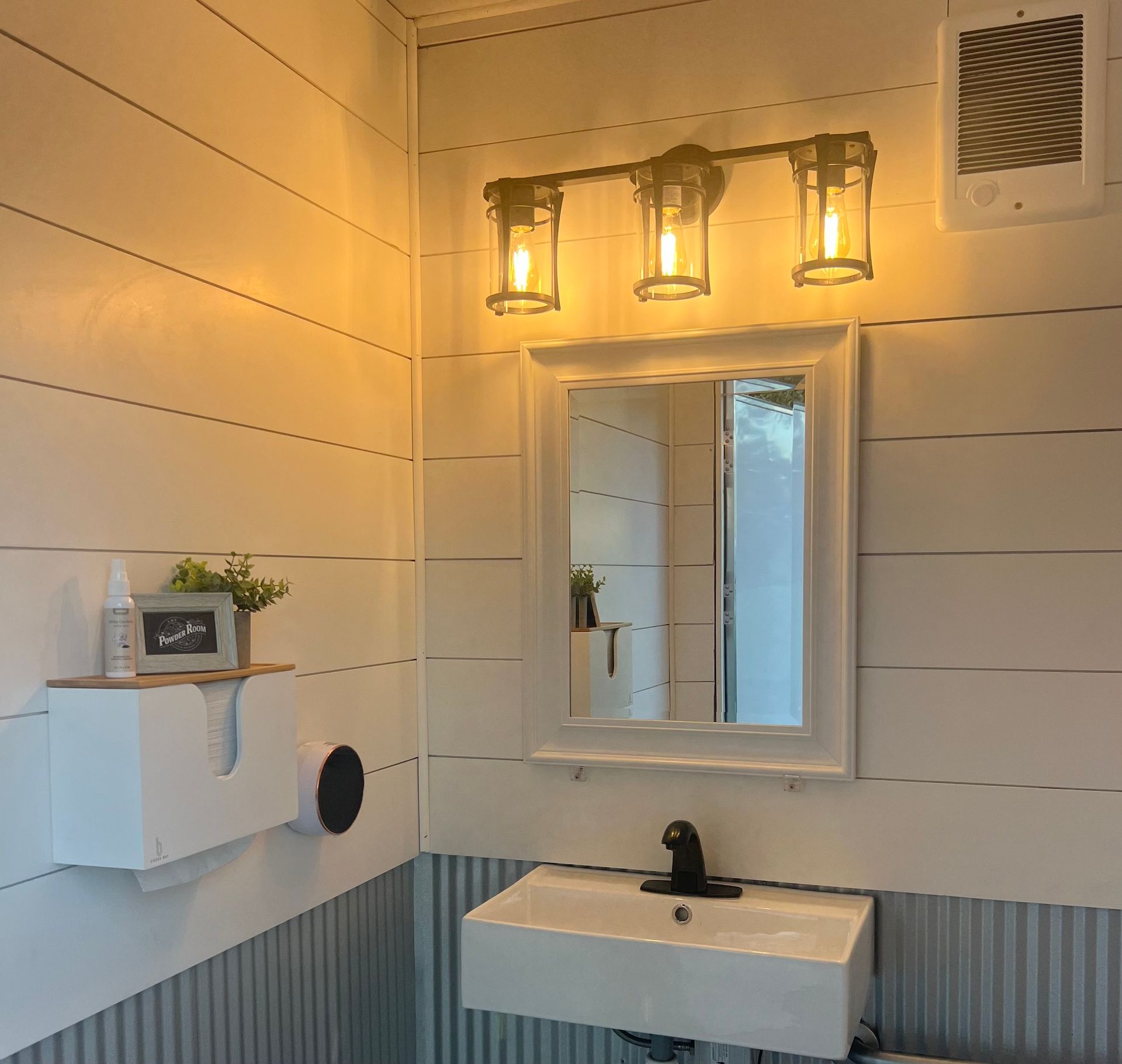 decorated in light gray and white shiplap and antique touchless black faucets and dispensers.